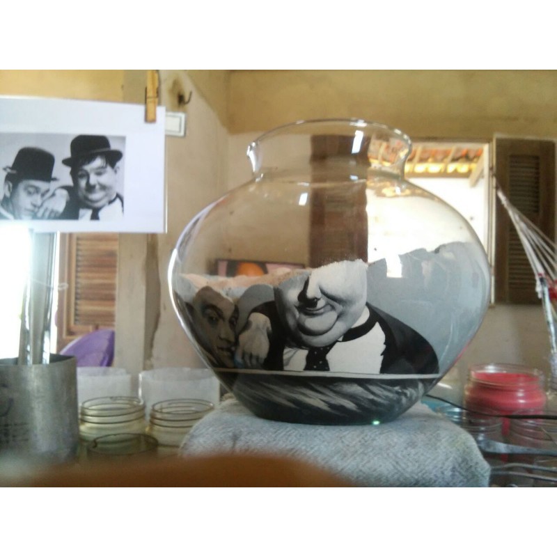 Stan Laurel en Oliver Hardy mogen natuurlijk ook niet ontbreken als televisiehelden uit het verleden. Samen met Charlie Chaplin die we later in de serie nog gaan tegenkomen waren zij toch wel iconen uit het zwart wit verleden. Vandaar ook dat wij Lidio gevraagd hebben om in een grotere mooie vaas deze filmsterren van het eerste uur in zandkorrels vast te leggen.