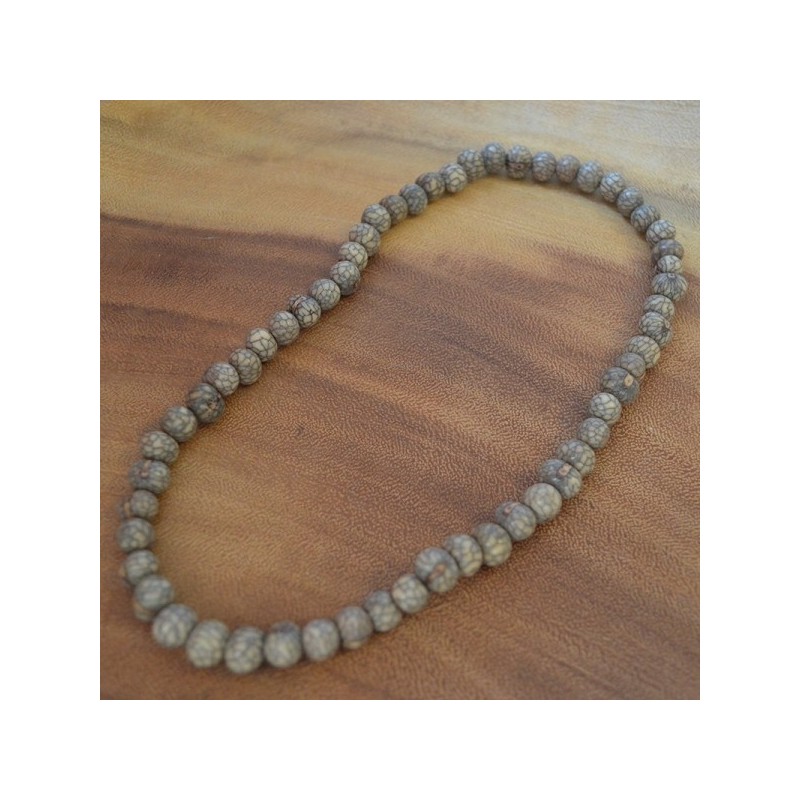 De ketting is ongeveer 43 cm en daarmee het halsmodel. In de ketting zit een dubbele elastiek die het omdoen van de ketting erg gemakkelijk maakt. De ketting mag niet in het water want van origine waren het ook zaadjes en u weet hoe zaden op water reageren.