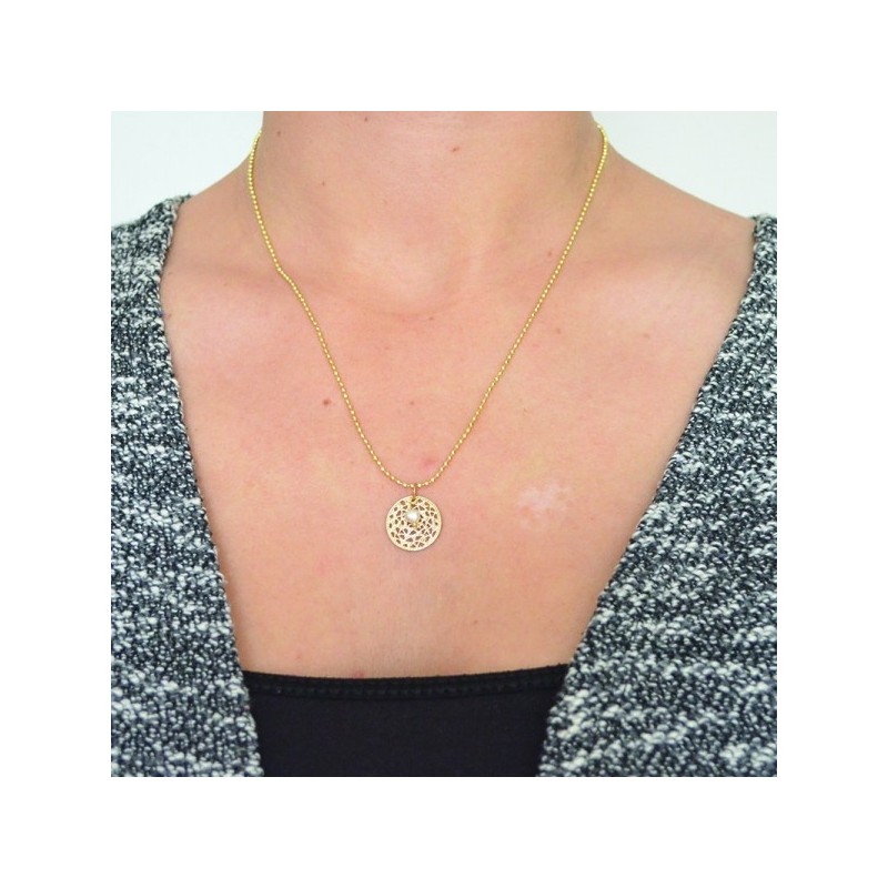 De ketting is 43 cm lang, het model halsketting, 1,25 mm dik en het type ballchain. Op de foto ziet u een zoetwater parel aan het bedeltje zitten, Parels staan voor rust en wijsheid, een eigenschap die altijd wel van pas komt. Mocht u de ketting liever zonder parel hebben dan kunt u de parel er af halen in het menu.
