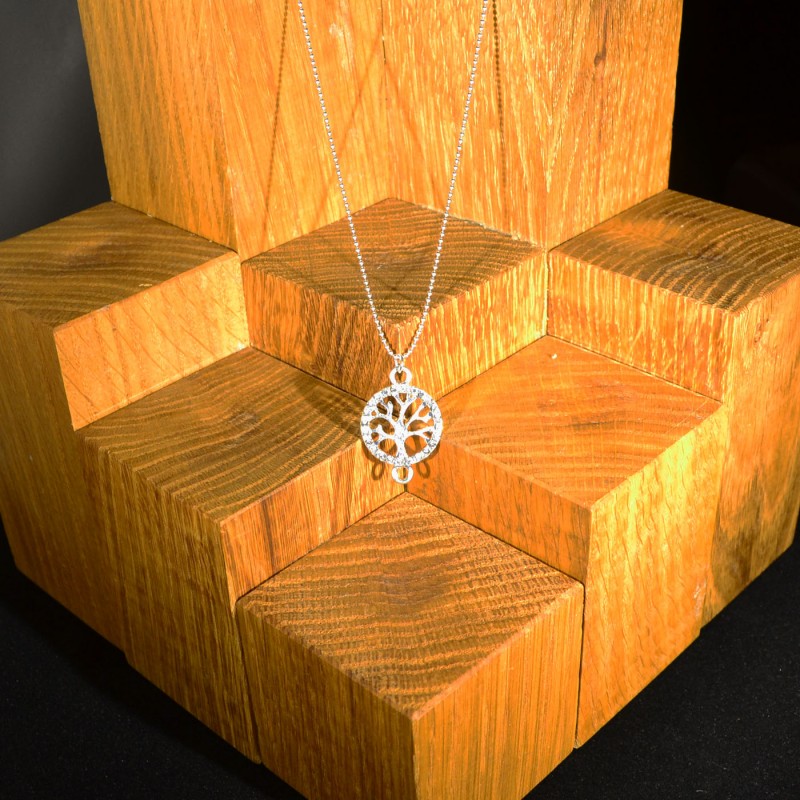Hier kijkt u naar een sterling zilveren ketting met een levensboom.  De levensboom staat voor wijsheid, kracht en bescherming. De ketting is het balletjes model, 925 sterling zilver, en heel fijntjes en elegant met een dikte van slechts 1,2 mm. De lengte van de ketting is 43 cm, de korte ketting, het halsmodel.