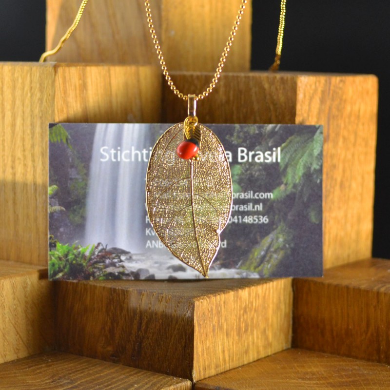 In dit geval van de echte bladeren moet u vooral uitkijken met water en de ketting op een normale plaats opbergen. Het is een natuurproduct en dat heeft een kleine gebruiksaanwijzing. De eucalyptusbladeren zijn werkelijk prachtig en vooral zo mooi omdat u er doorheen kunt kijken waardoor het overgebleven skelet mooi zichtbaar wordt. Het rode Huayruro zaadje wat u ziet wordt door de locals in Brazilië gezien als Lucky bean die tegelijkertijd de slechte invloeden zoals boze geesten en nachtmerries op een afstand houd.