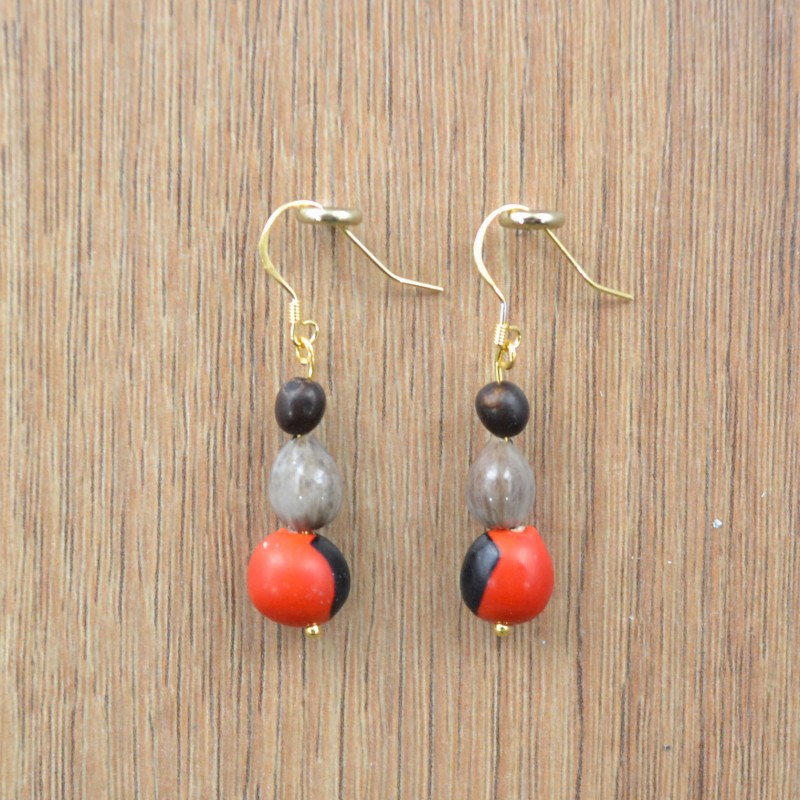 In het geval van deze oorbellen gaat het om een palmpit, een Lagrima pitje en een zaadje uit de Huayruro familie. De palmboom levert ruimschoots de meeste kralen in onze natuurkralen collectie die ondertussen bijna uit honderd soorten bestaat. De Lagrimas staan in de Braziliaanse cultuur voor bescherming en de Huayruro zaden zouden de slechte invloeden op een afstand houden. Reden genoeg dat deze kralen heel veel gebruikt worden in heel Zuid-Amerika. Hier in Nederland worden ze meestal nog steeds gewoon gekocht omdat het een paar originele kleurrijke oorbellen zijn.