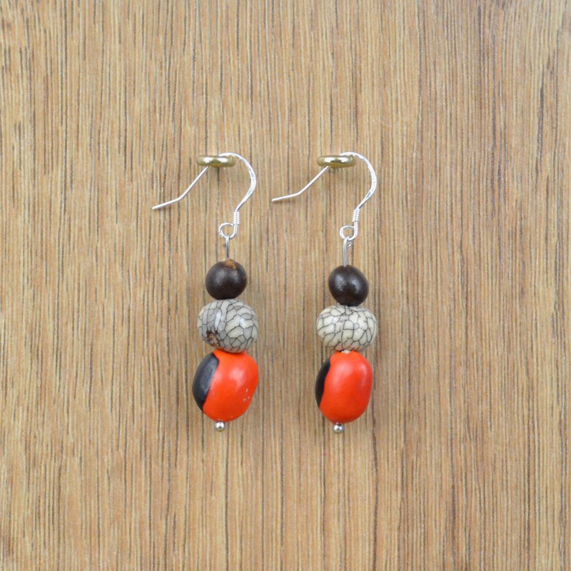 De kralen zijn van boven naar beneden een palmpit, een acai bes en een huayruro zaadje. De palmboom levert in onze natuurkralen collectie ongeveer tien kralen soorten. Acai kennen wij in Nederland uit het superfood circuit en na een intensief recycling proces is dit van het restant te maken. De giftige huayruro zaden staan in Brazilië voor bescherming, kan nooit kwaad dus. Een origineel paar oorbellen die u hier in Nederland zelden zult tegenkomen.