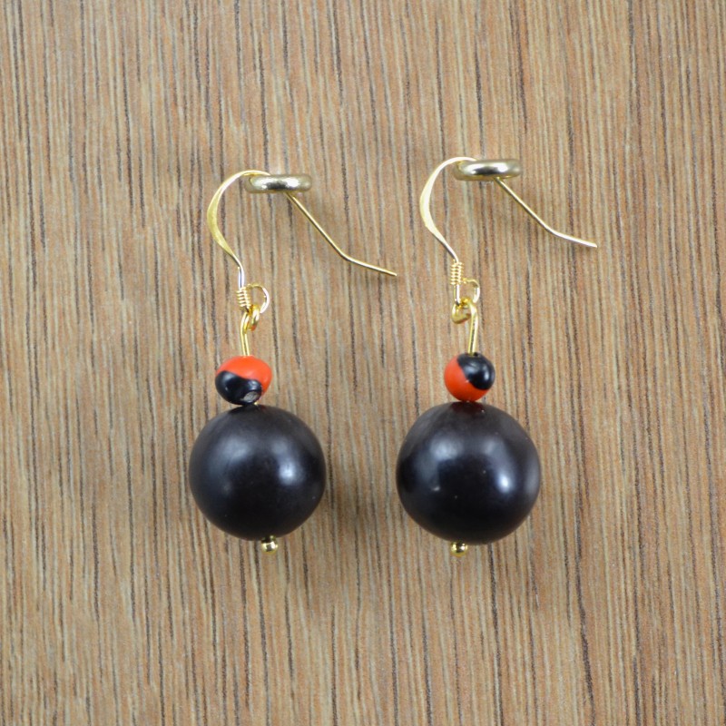 De gouden Amazone oorbellen serie gaat verder met deze mooie en subtiele zwart/rode natuurkralen oorbellen. De haakjes zijn zoals altijd bij de gouden oorbellen verguld 925 sterling zilver en de gerecyclede kralen komen uit de Amazone.