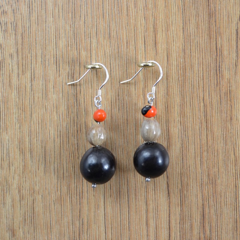 De kralen aan deze oorbellen zijn een rood met zwarte stip giftig Huayruro zaadje, een Lagrima di Maria pitje en een niet eetbaar Saboneteira nootje. Gekleurd zijn de kralen door het bos want wij laten al onze kralen zoals ze van nature zijn. Alles milieuvriendelijk en fairtrade.