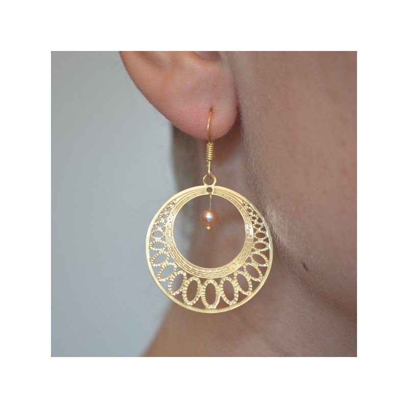 Het bedeltje noemen wij onze zon en de kralen die u in de oorbellen ziet hangen zijn zoetwater parels. In Brazilië staan parels voor rust,wijsheid en concentratie, nooit weg in deze roerige tijden.